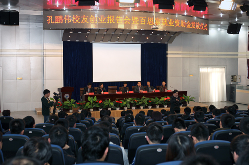 2013年3月25日下午,孔鹏伟校友创业报告会暨百思富就业资助金发放仪式在思贤楼报告厅举行。山西百思富餐饮管理集团有限公司董事长、我校校友孔鹏伟,校党委常委、副校长吕明及相关部门负责人、受资助的50名毕业生(其中我院获资助的给排水0901班姜俐峰和环工0901班赵强)和各学院学生代表等340余人参加了本次活动。